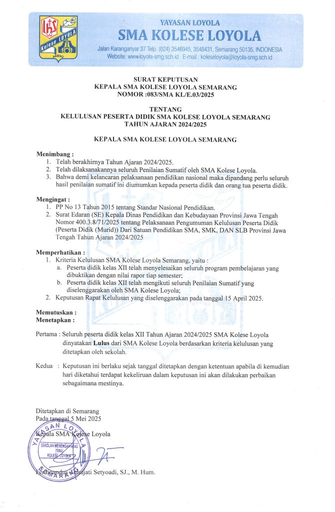 Pengumuman Kelulusan SMA Kolese Loyola Tahun Ajaran 2024 / 2025 Read More »