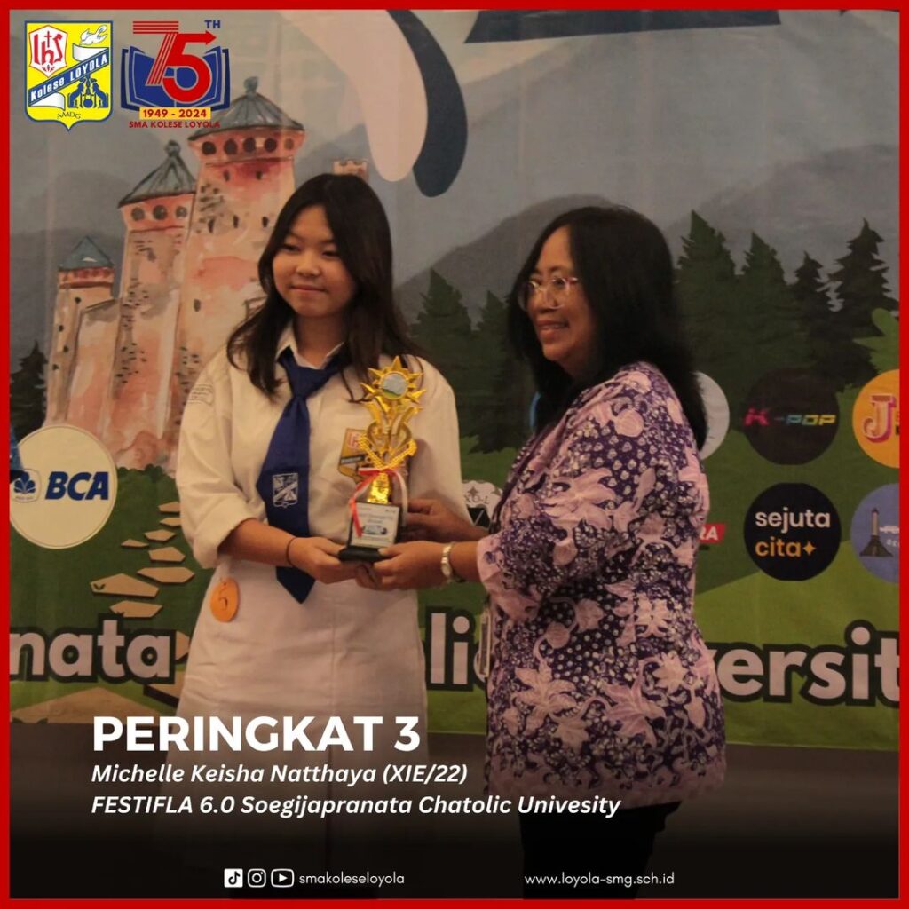 Proficiat! Michelle Keisha Natthaya (XIE/22) meraih peringkat 3 dalam lomba akademik berbahasa inggris FESTIFLA 6.0 2024 yang diadakan oleh Universitas Katolik Soegijapranata. Ad Maiorem Dei Gloriam #smakoleseloyola #koleseloyola #loyolacollege #semarang …