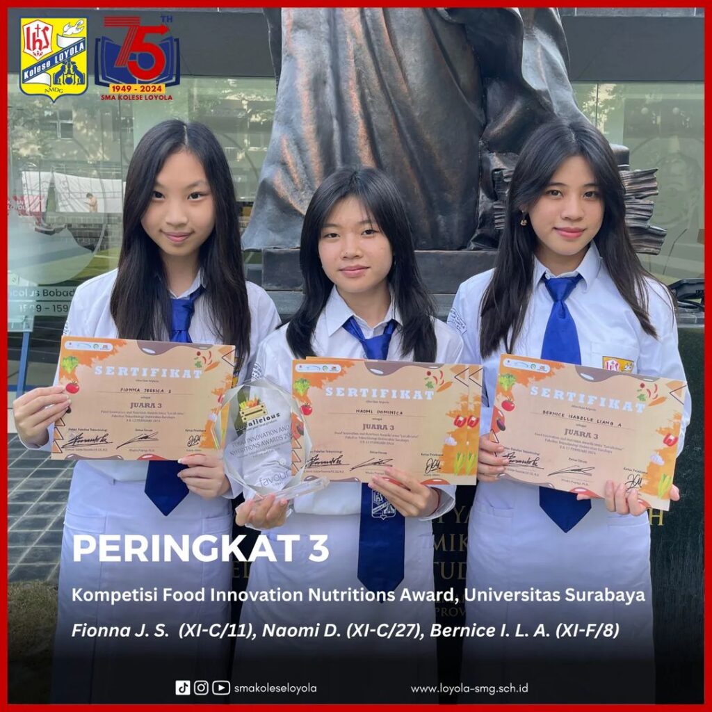 Proficiat kepada Fionna Jessica Soenito (XI-C/11), Naomi Dominica (XI-C/27), dan Bernice Isabelle Liang A (XI-F/8) telah meraih peringkat 3 dalam lomba Food Innovation Nutritions Award (FINA) yang diselenggarakan Universitas …