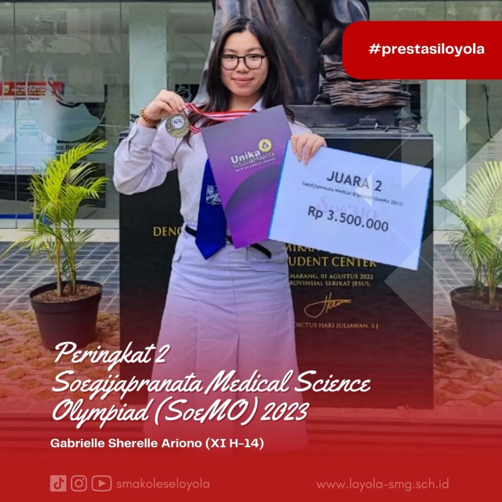 Proficiat kepada Gabrielle Sherelle Ariono (XI H-14) @sherellegabrielle meraih peringkat 2 dalam Soegijapranata Medical Science Olympiad (SoeMO) 2023. Soegijapranata Medical Science Olympiad (SoeMo) adalah kompetensi sains dan kedokteran untuk pelajar SMA/sederajat …