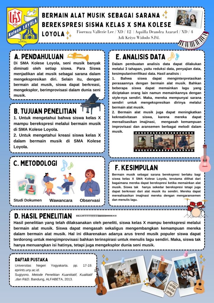BERMAIN ALAT MUSIK SEBAGAI SARANA BEREKSPRESI SISWA KELAS X SMA KOLESE LOYOLA / Curriculum - Penelitian dan Poster Ilmiah / By dhn Penelitian Oleh : Fiorenza Vallerie Lee ( XD / 12), Aquilla Deandra Azarael (XD / 04)