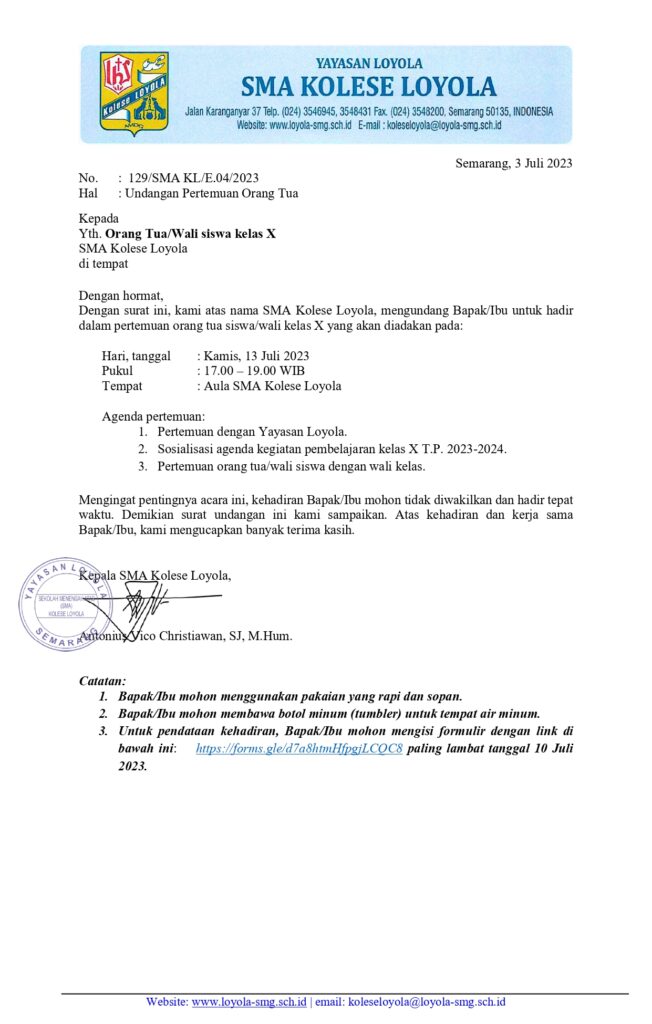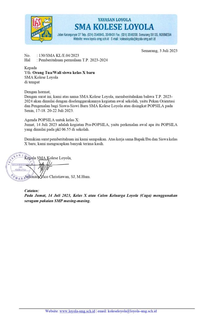 Pemberitahuan Permulaan Tahun Pelajaran 2023 – 2024 Pekan Orientasi dan Pengenalan bagi Siswa – Siswi Baru SMA Kolese Loyola (POPSILA)