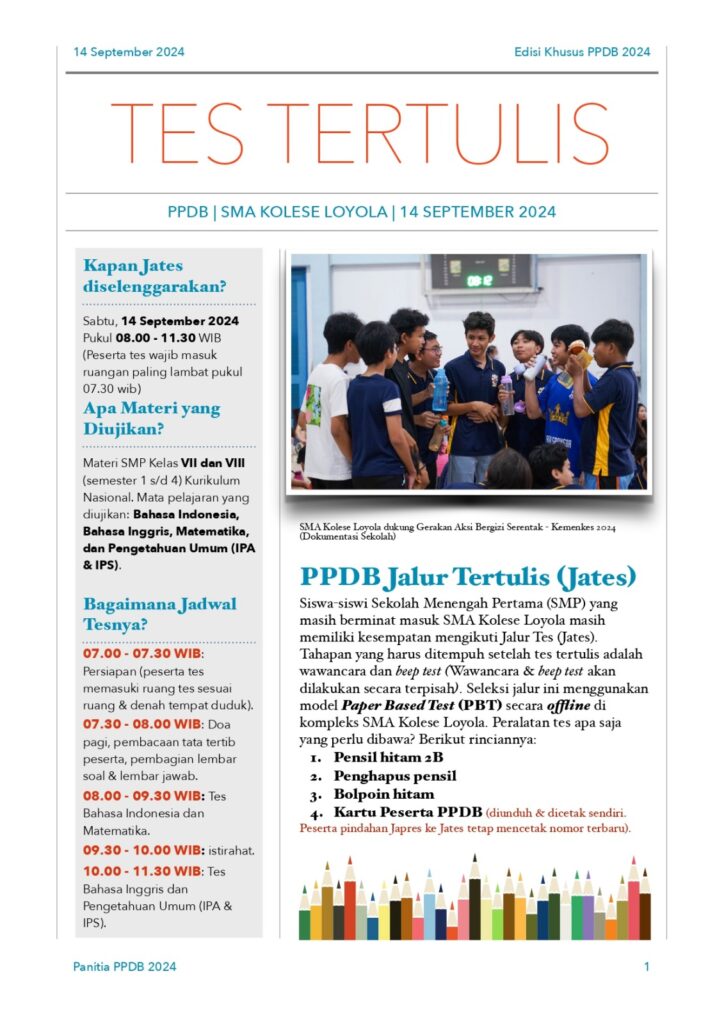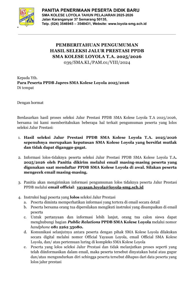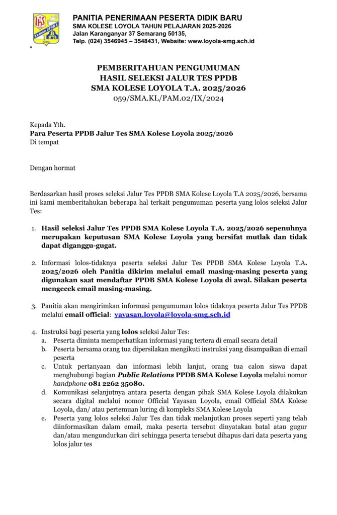 PENGUMUMAN HASIL SELEKSI JALUR TES PPDB SMA KOLESE LOYOLA T.A. 2025/2026