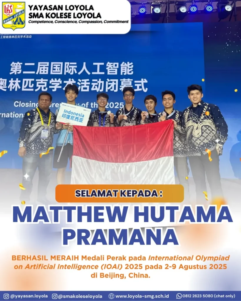 🎉 Proficiat kepada Matthew Hutama Pramana (XII-H/27)! 🎉Sebuah prestasi membanggakan berhasil ditorehkan oleh Matthew yang sukses meraih Medali Perak pada ajang International Olympiad on Artificial Intelligence (IOAI) 2025 yang diselenggarakan …