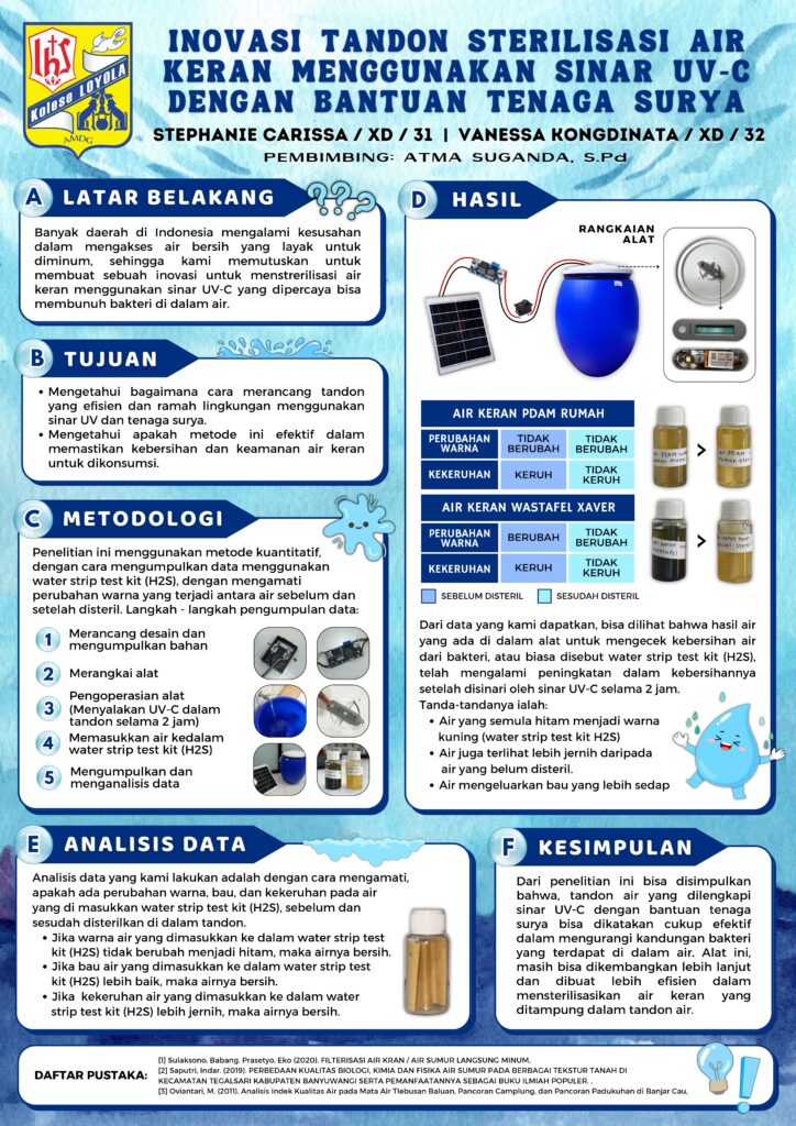 INOVASI TANDON STERILISASI AIR KERAN MENGGUNAKAN SINAR UV-C DENGAN BANYUAN TENAGA SURYA / Curriculum - Penelitian dan Poster Ilmiah / By dhn Penelitian Oleh : Stephanie Carissa (XD / 31), Vanessa Kongdinata (XD / 32)