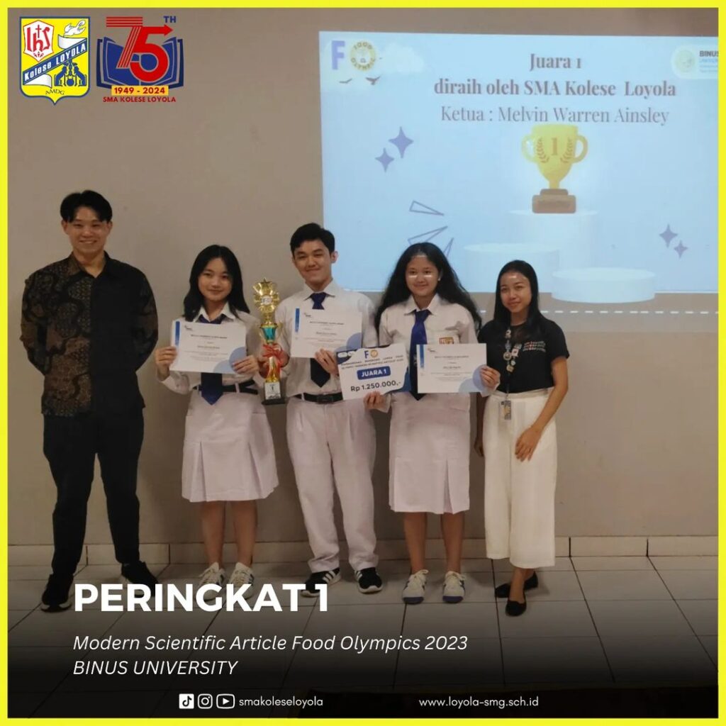 Proficiat kepada Alina Zada Nugroho (XI-E/02), Melvin Warren Ainsley (XI-E/21), dan Devine Charista Birawa (XI-D/09) telah meraih peringkat 1 dalam kompetisi Modern Scientific Article Food Olympics 2023, yang diadakan BINUS Alam Sutera.