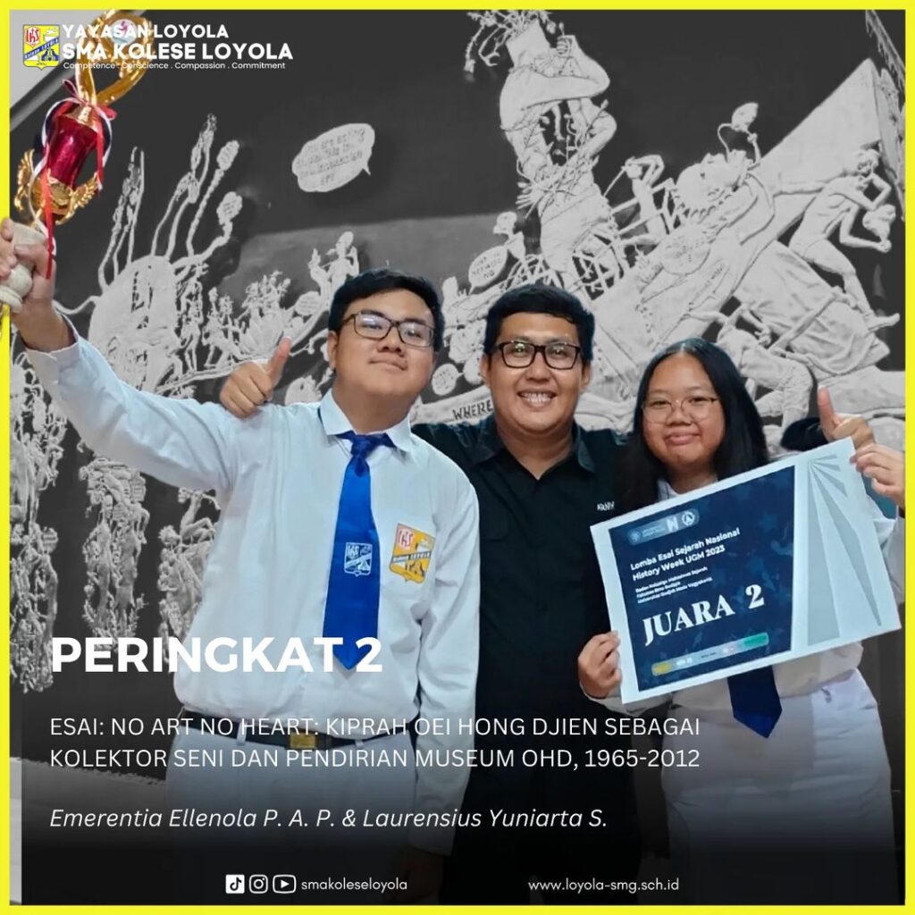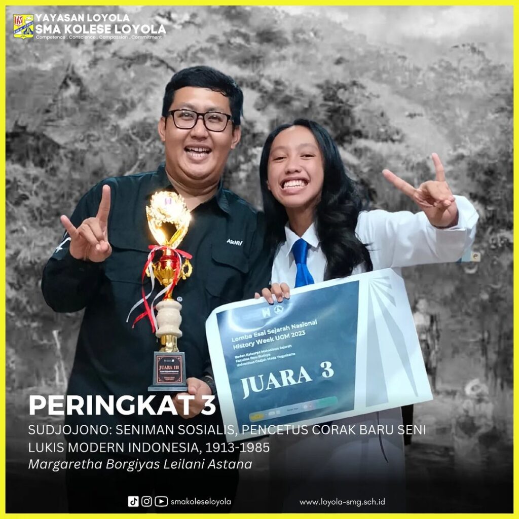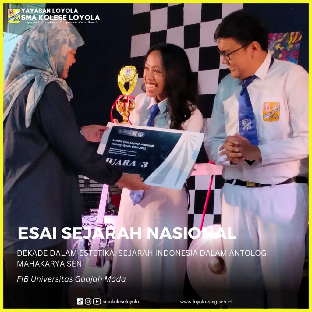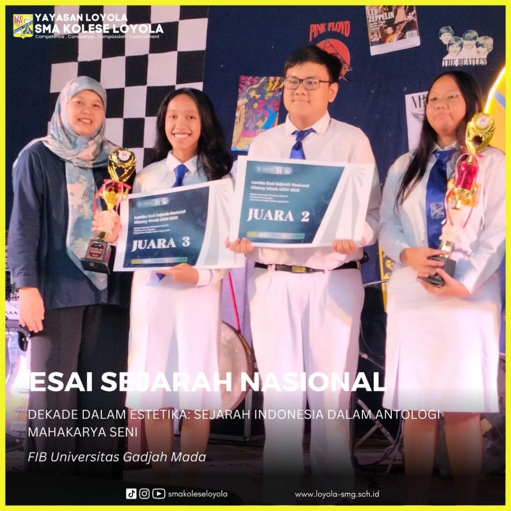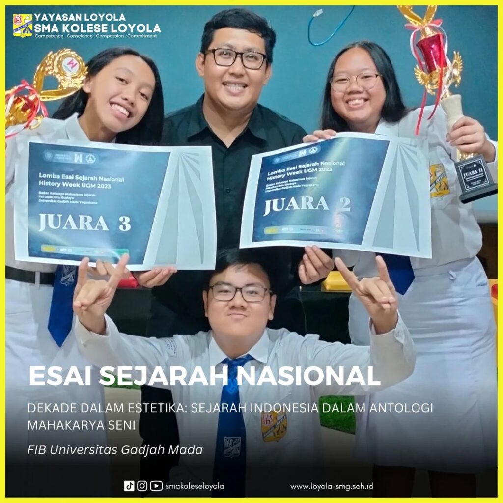Dua tim siswa @smakoleseloyola sukses menyumbangkan prestasi di bidang Esai Sejarah Nasional (ESN) tingkat pelajar dalam @historyweekugm 2023 bertema “Dekade dalam Estetika: Sejarah Indonesia dalam Antologi Mahakarya Seni” yang digelar Badan Keluarga Mahasiswa Sejarah Fakultas Ilmu Budaya Universitas Gadjah Mada Yogyakarta @bkms_ugm pada 23-27 Oktober 2023. Mereka adalah Emerentia Ellenola Paramahita Aji P. (XII A/6) @ellen.ola dan Laurensius Yuniarta Sugianto (XII X/11) @laurensiusyuniarta_ meraih Peringkat Kedua melalui karya yang berjudul “No Art No Heart: Kiprah Oei Hong Djien sebagai Kolektor Seni dan Pendirian Museum OHD, 1965-2012”, serta Margaretha Borgiyas Leilani Astana (XII C/13) @latteretha meraih Peringkat Ketiga melalui karya yang berjudul “Sudjojono: Seniman Sosialis, Pencetus Corak Baru Seni Lukis Modern Indonesia, 1913-1985”. Selamat semuanya. Terima kasih atas pendampingan tim MGBS Sejarah & Bapak Joseph Army Sadhyoko @joseph_army. AMDG.