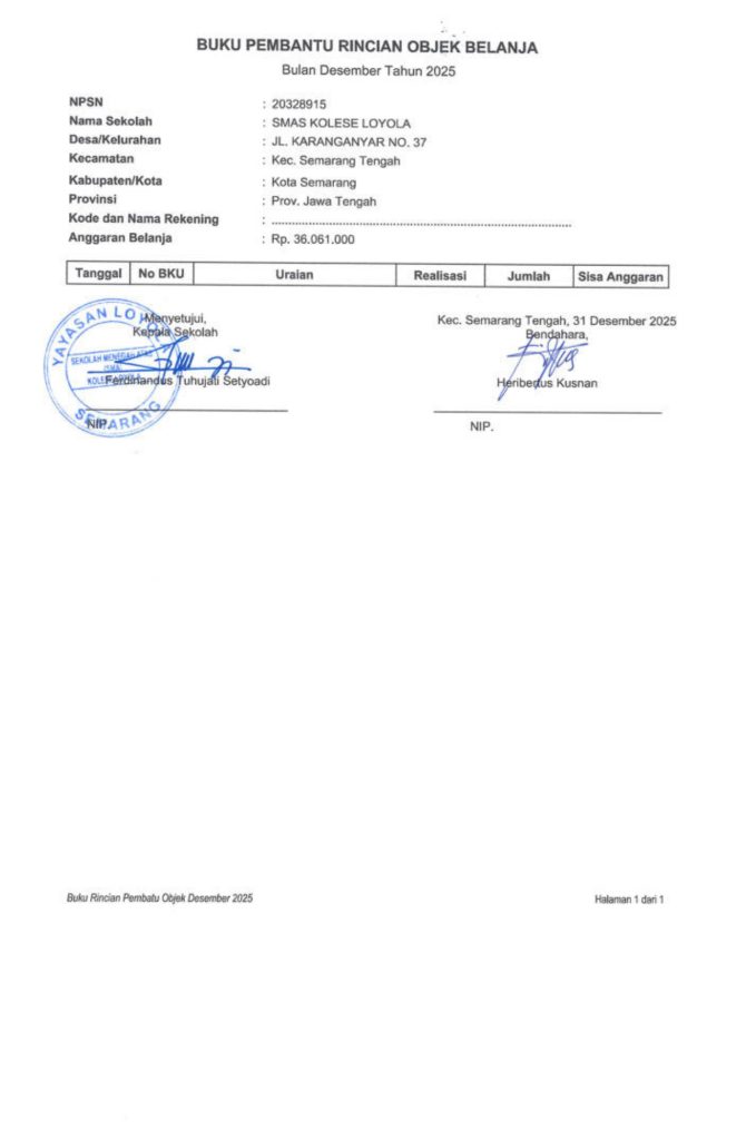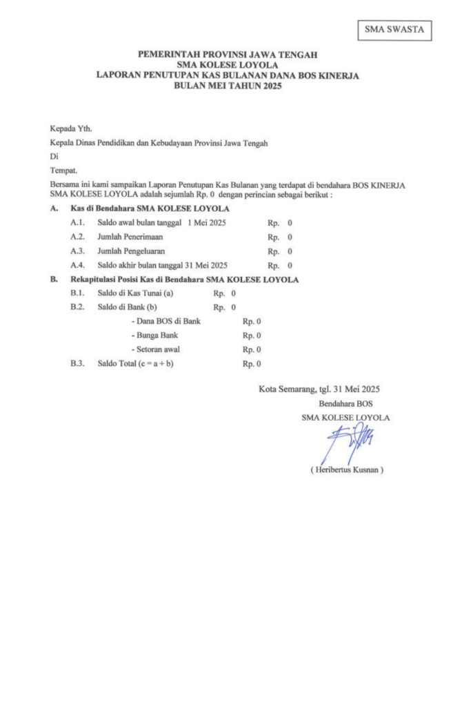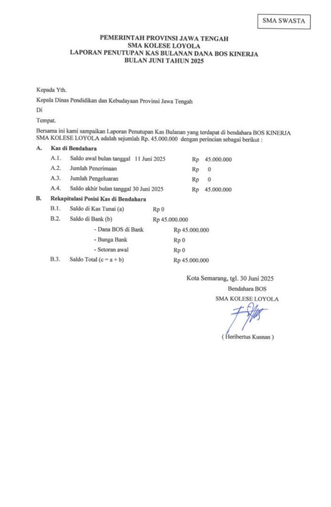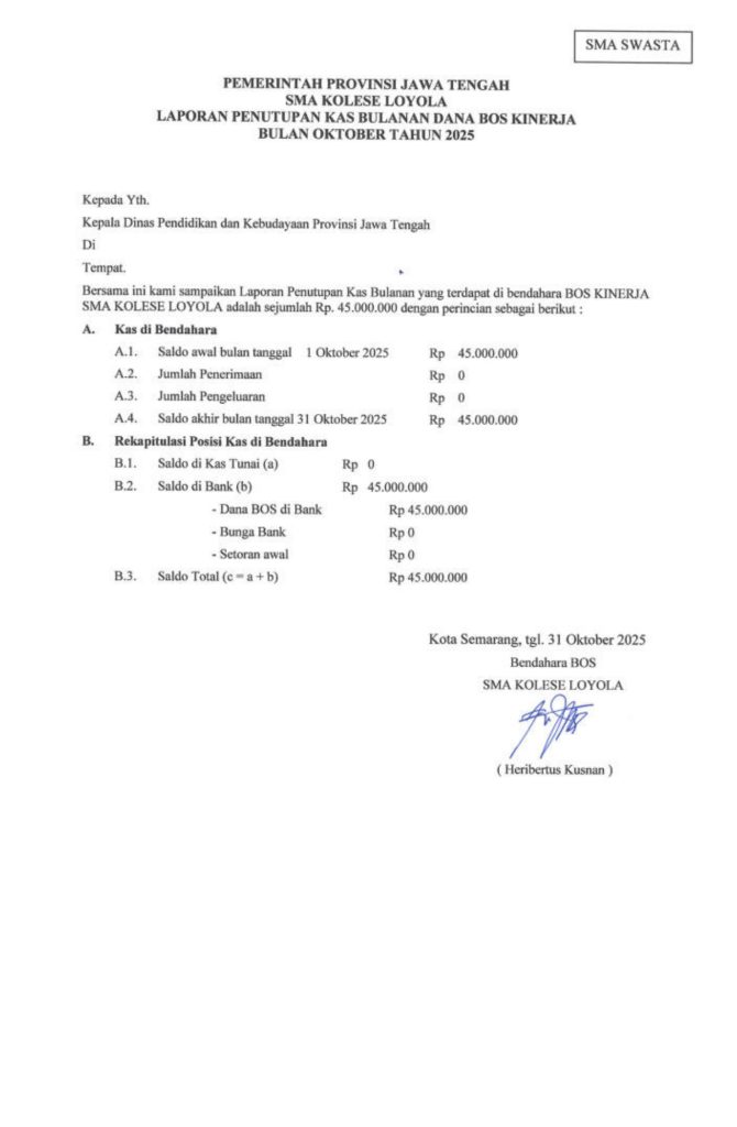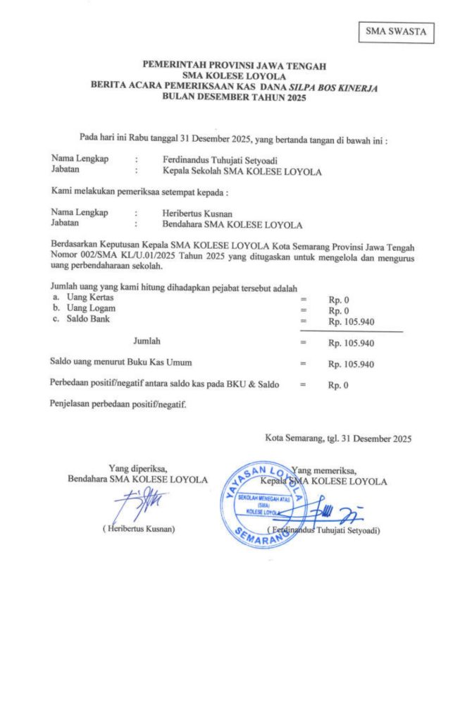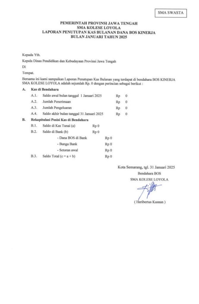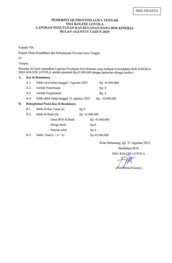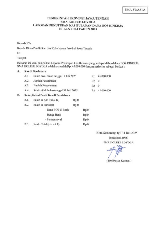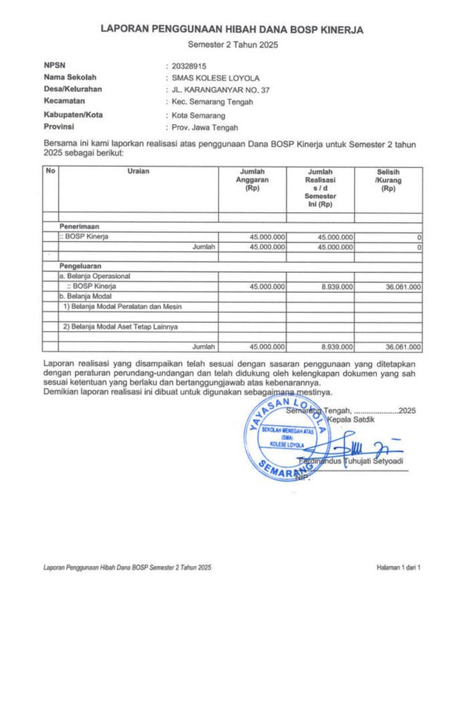 Laporan Pertanggungjawaban Dana Bantuan Operasional Sekolah Kinerja Sekolah Menengah Atas Tahun 2025 – SMA Kolese Loyola