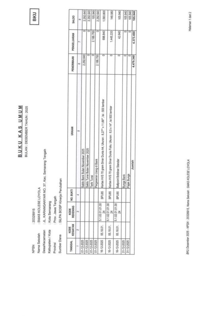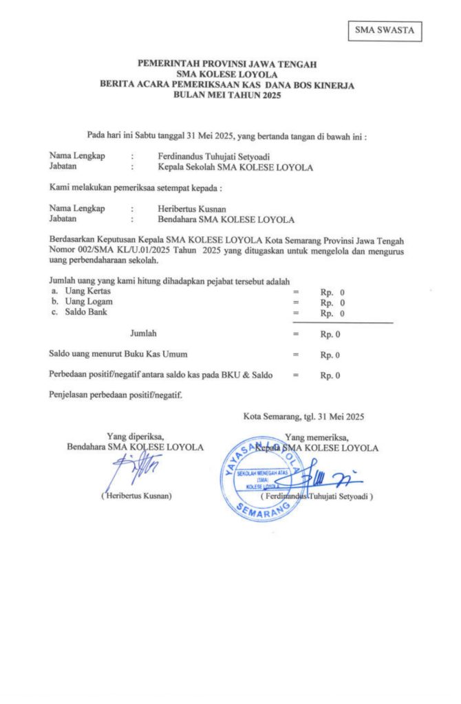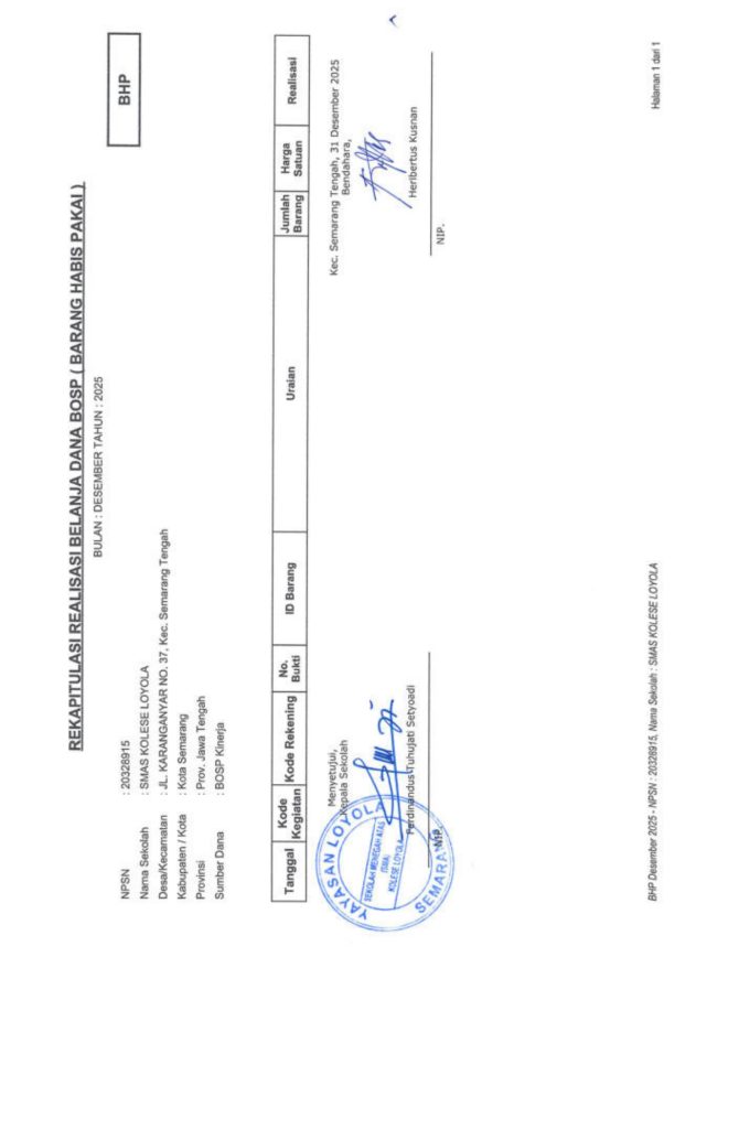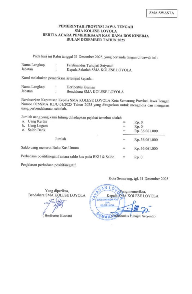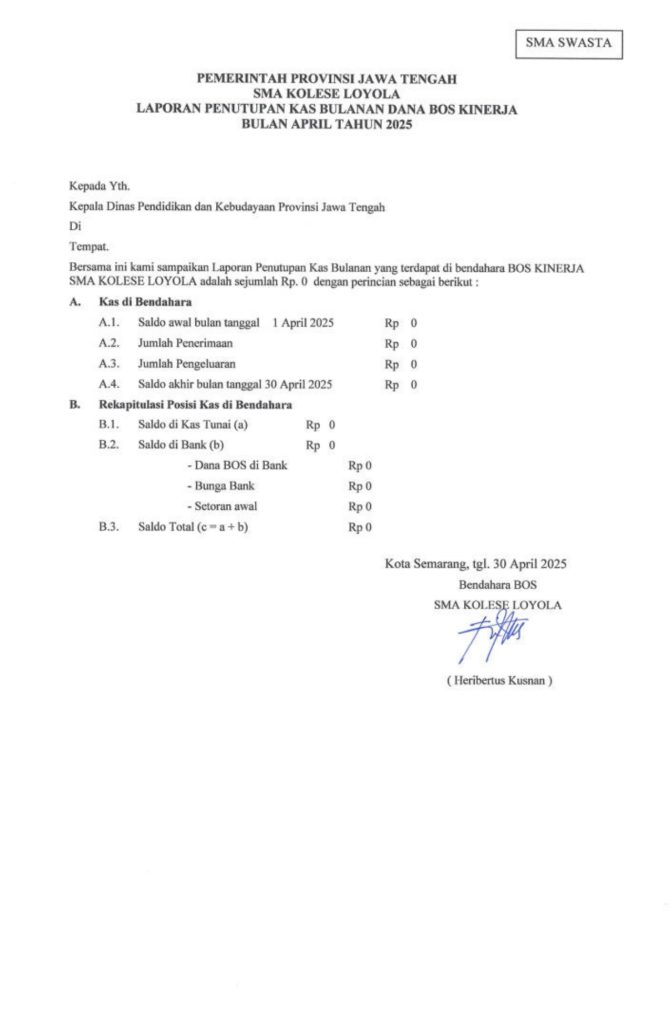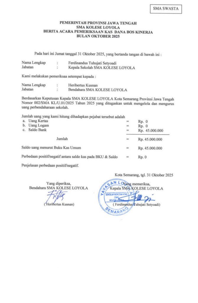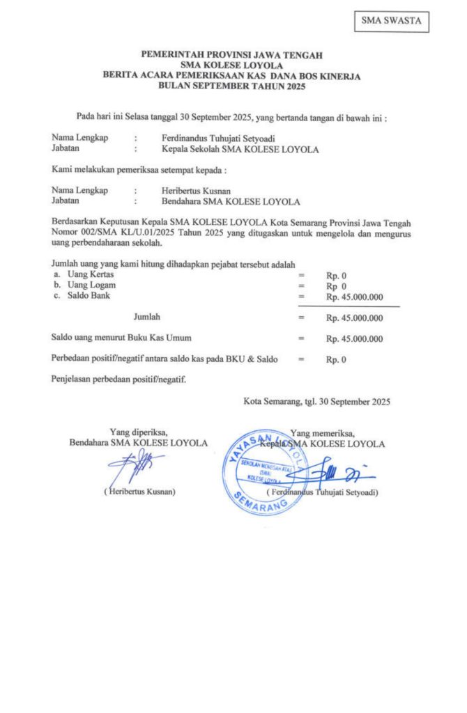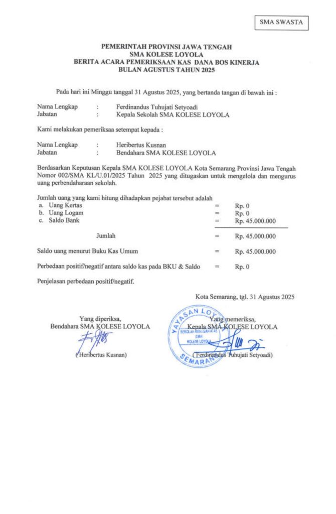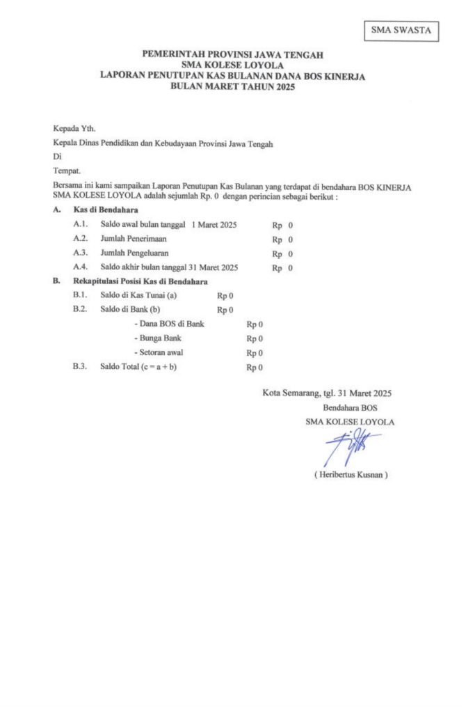 Laporan Pertanggungjawaban Dana Bantuan Operasional Sekolah Kinerja Sekolah Menengah Atas Tahun 2025 – SMA Kolese Loyola