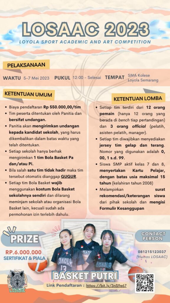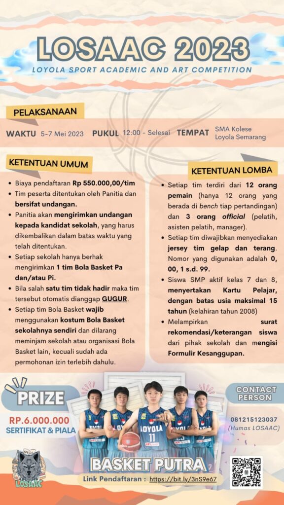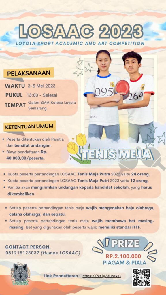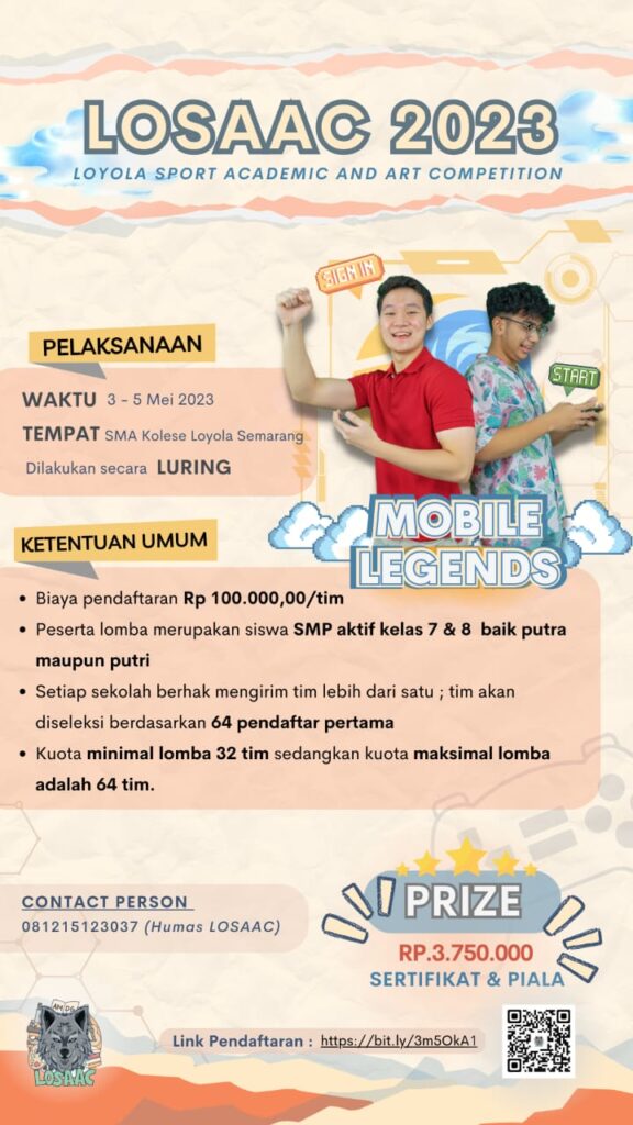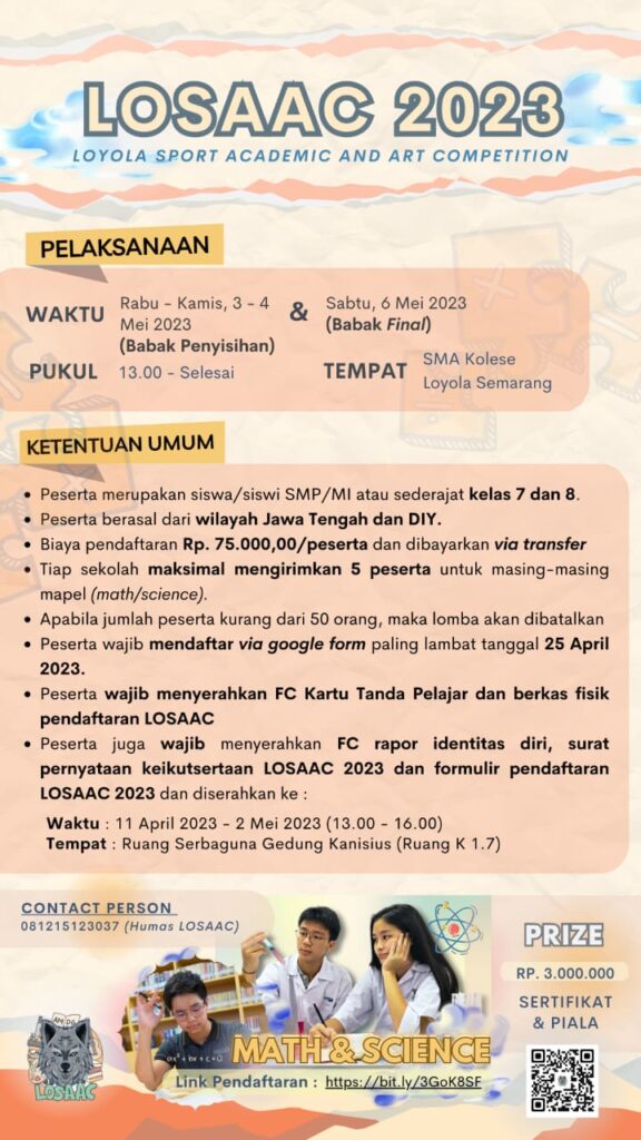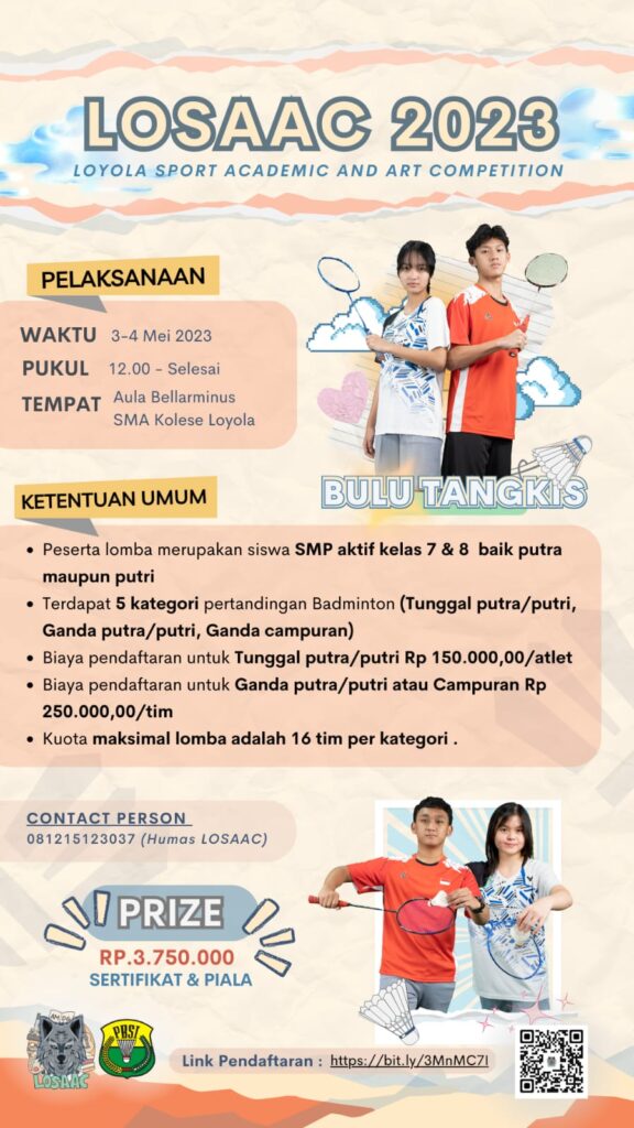 SMA Kolese Loyola Semarang akan menyelenggarakan Kompetisi Olahraga, Seni, dan Akademik se-JATENG dan DIY untuk tingkat SMP/Sederajat se-Jateng dan DIY dengan ๐ง๐ข๐ง๐๐ ๐๐๐๐๐๐ ๐ฆ๐๐๐๐ฆ๐๐ฅ ๐ฑ๐ฒ ๐๐๐๐ฎ