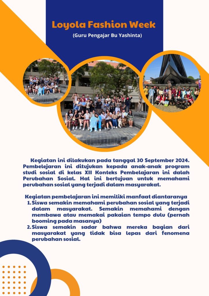 Loyola Fashion Week adalah sebuah pembelajaran yang ditujukan kepada anak – anak program studi sosial di kelas XII untuk menunjukan suatu perubahan sosial di masyarakat.