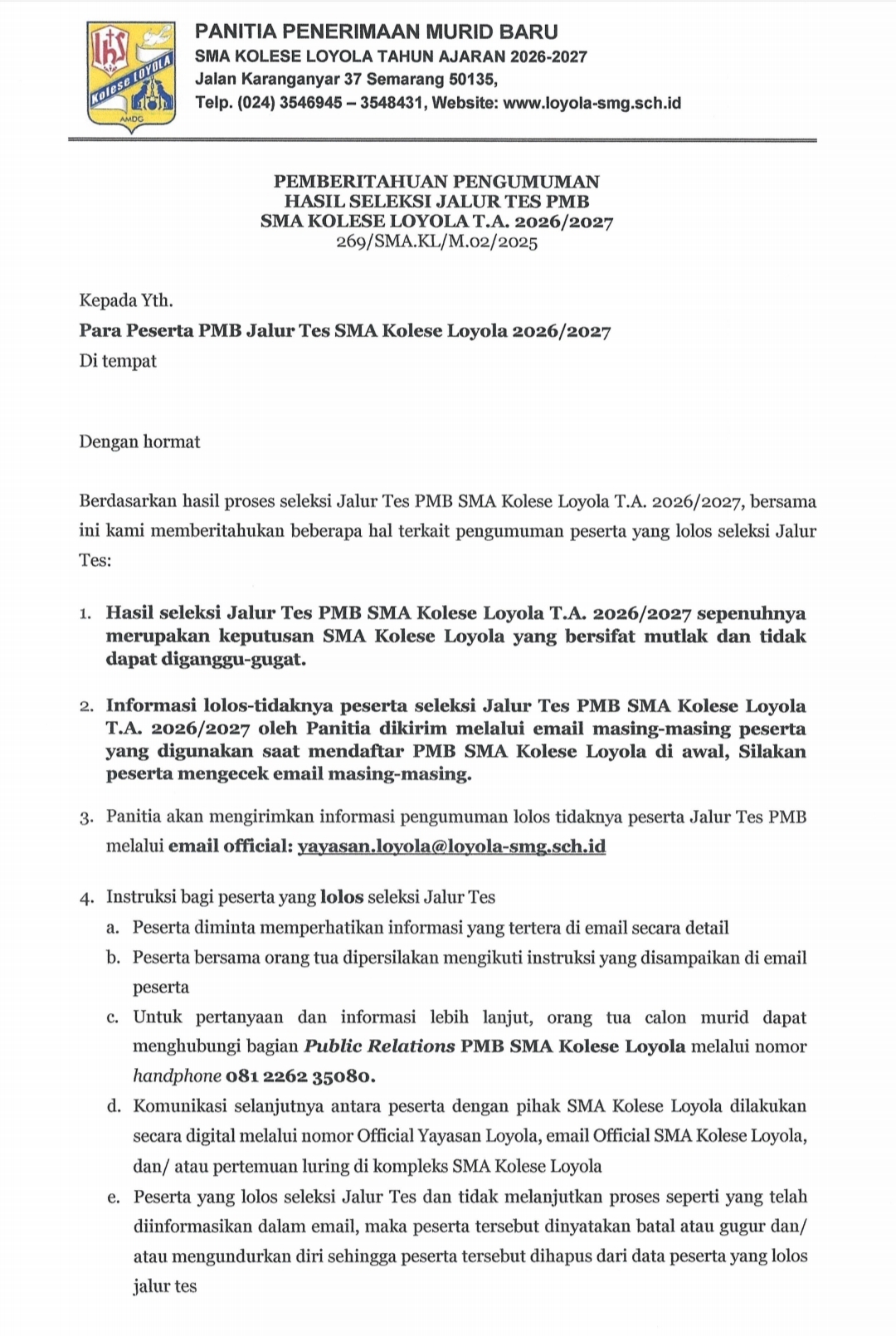 pengumuman hasil seleksi jalur tes PMB SMA Kolese Loyola T.A. 2026/2027 / Berita dan Acara Updated / By dhn Berikut ini pemberitahuan pengumuman hasil seleksi jalur tes PMB SMA Kolese Loyola T.A. 2026/2027 Silahkan cek bagian SPAM apabila pesan tidak terdapat di INBOX / Kotak Masuk.
