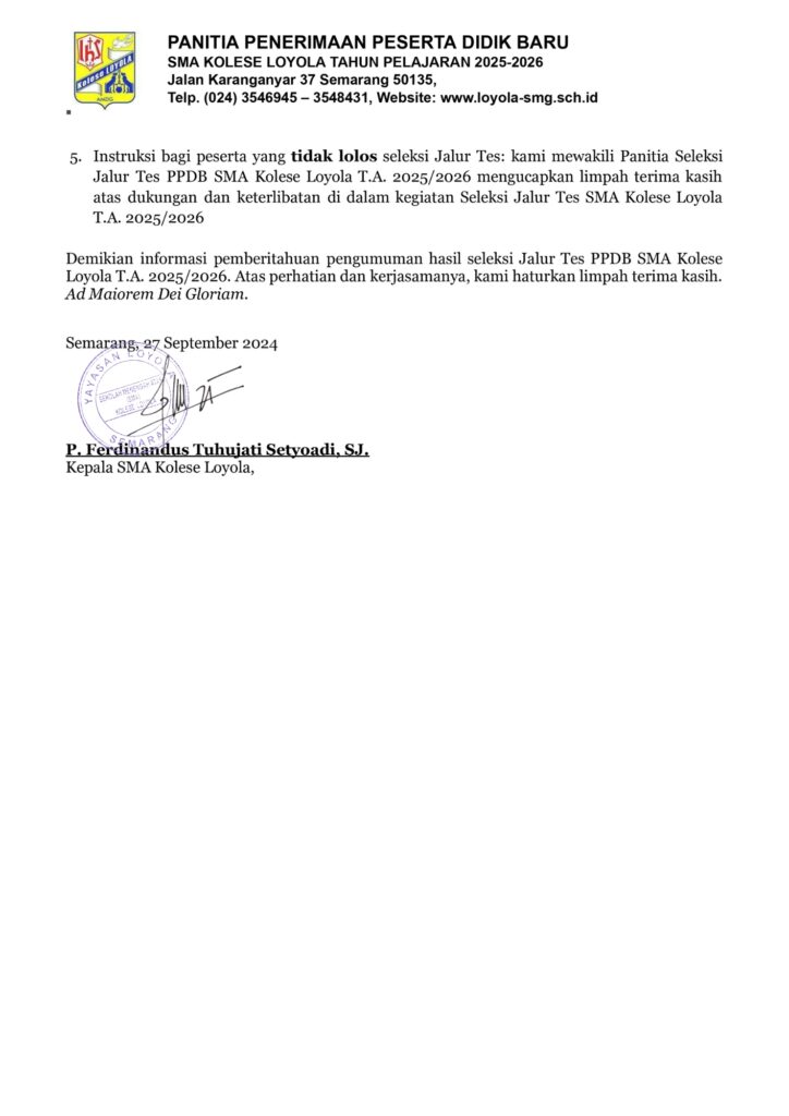 PENGUMUMAN HASIL SELEKSI JALUR TES PPDB SMA KOLESE LOYOLA T.A. 2025/2026 / Berita dan Acara Updated / By dhn Berikut ini pemberitahuan pengumuman hasil seleksi jalur tes PPDB SMA Kolese Loyola T.A. 2025/ 2026 Silahkan cek bagian SPAM apabila pesan tidak terdapat di INBOX / Kotak Masuk.