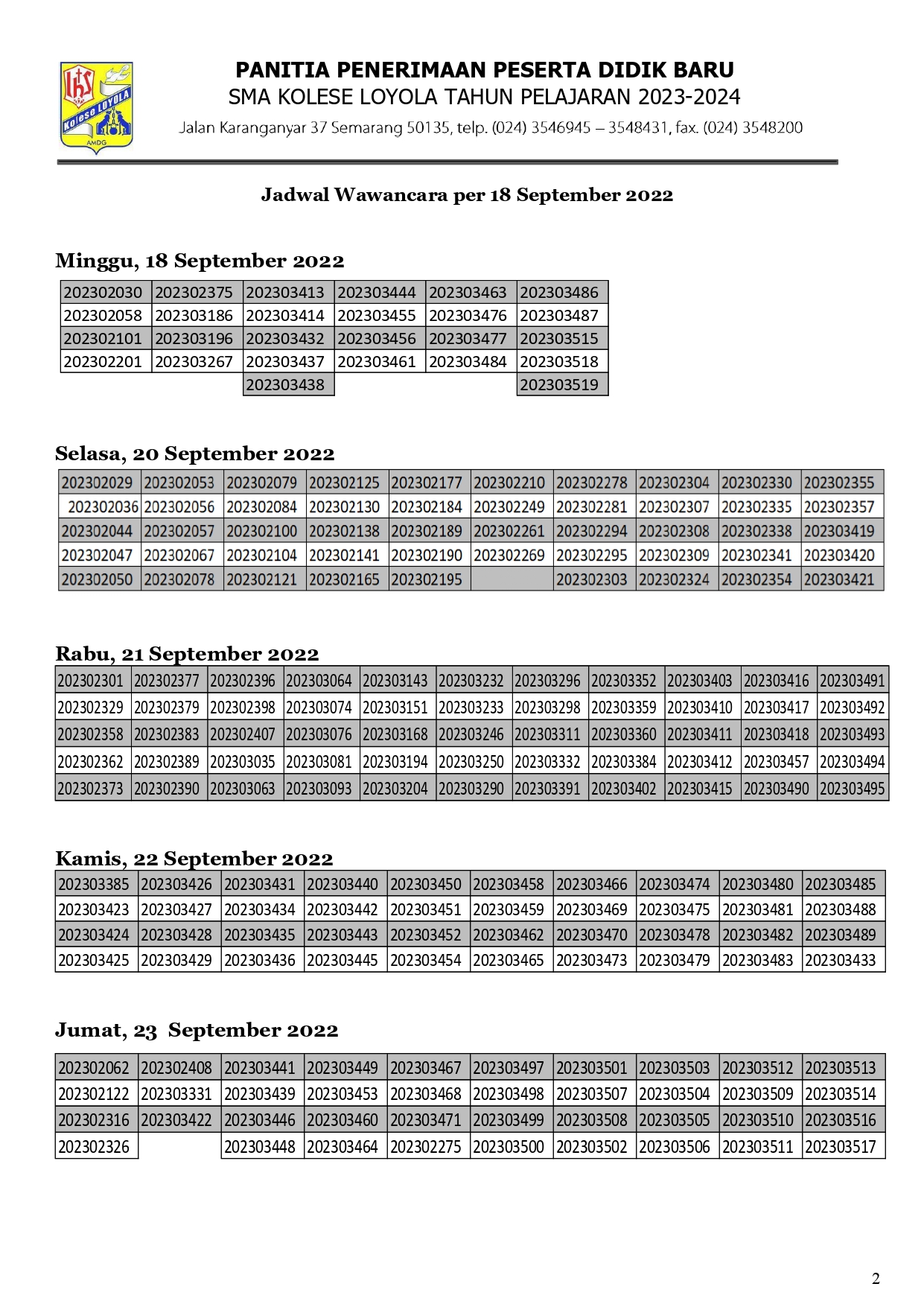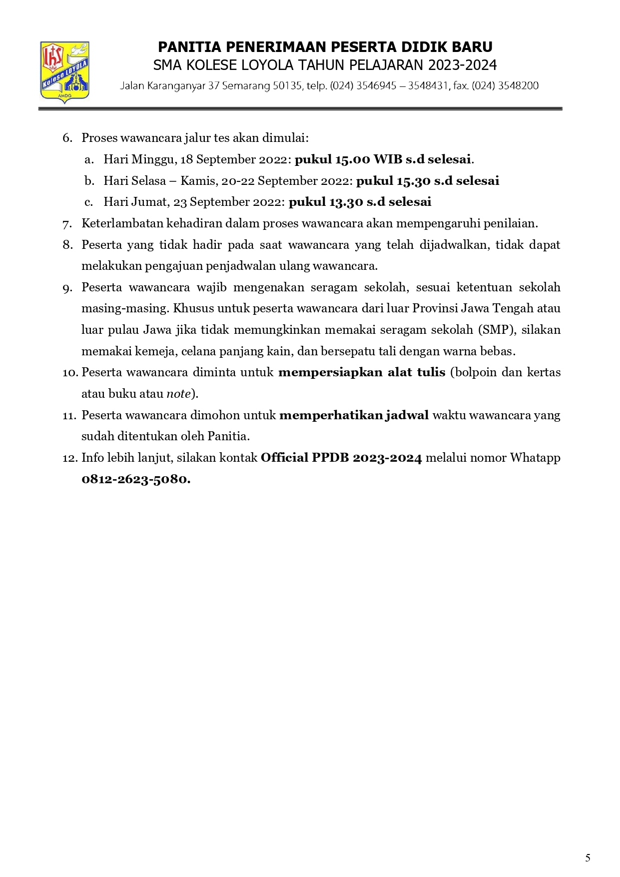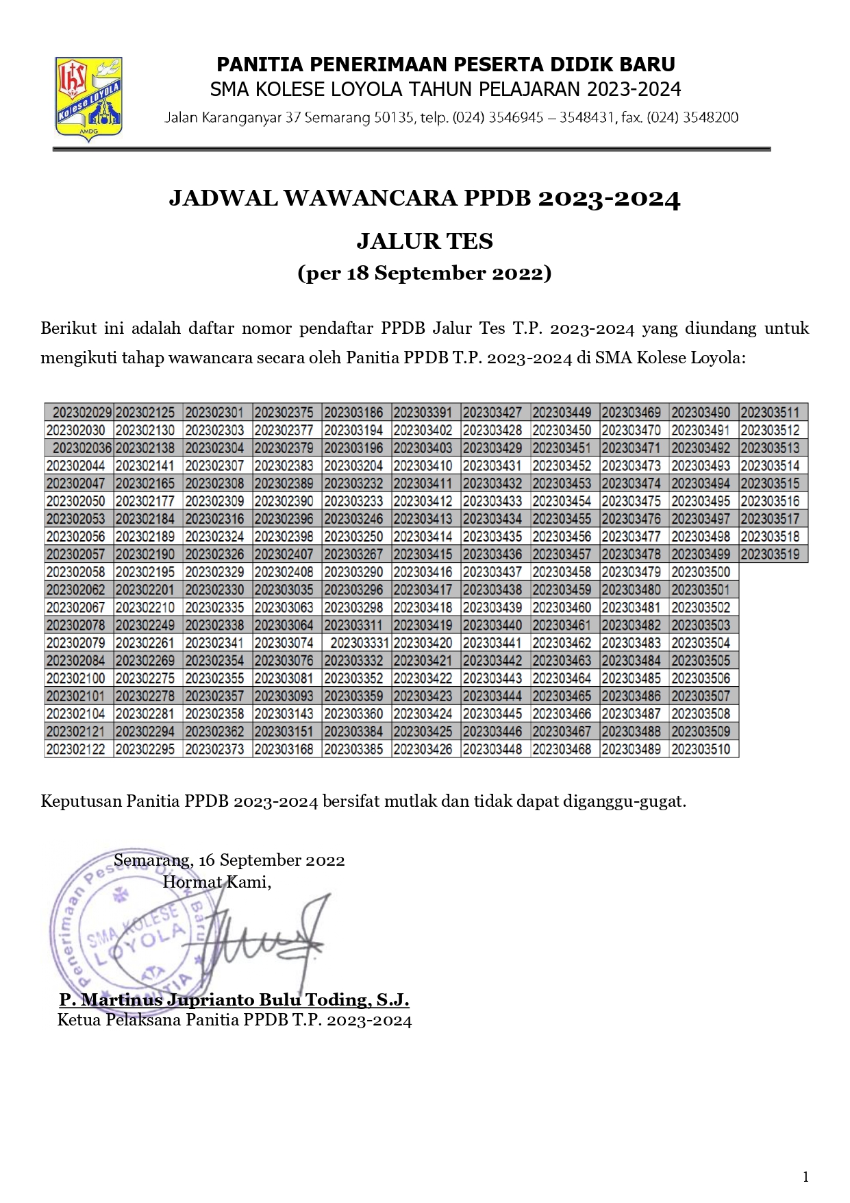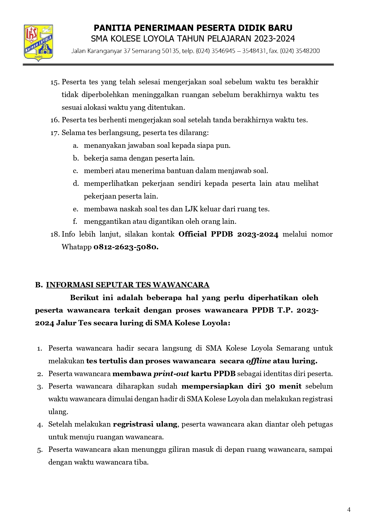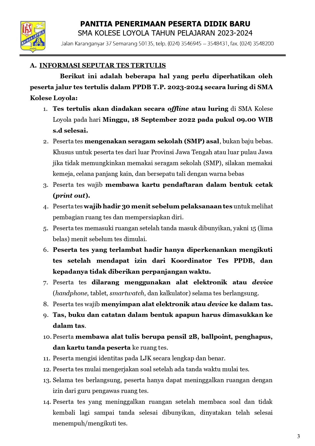 Pengumuman Jadwal Tes Tertulis dan Wawancara Jalur Tes PPDB TP 2023 / 2024 SMA Kolese Loyola