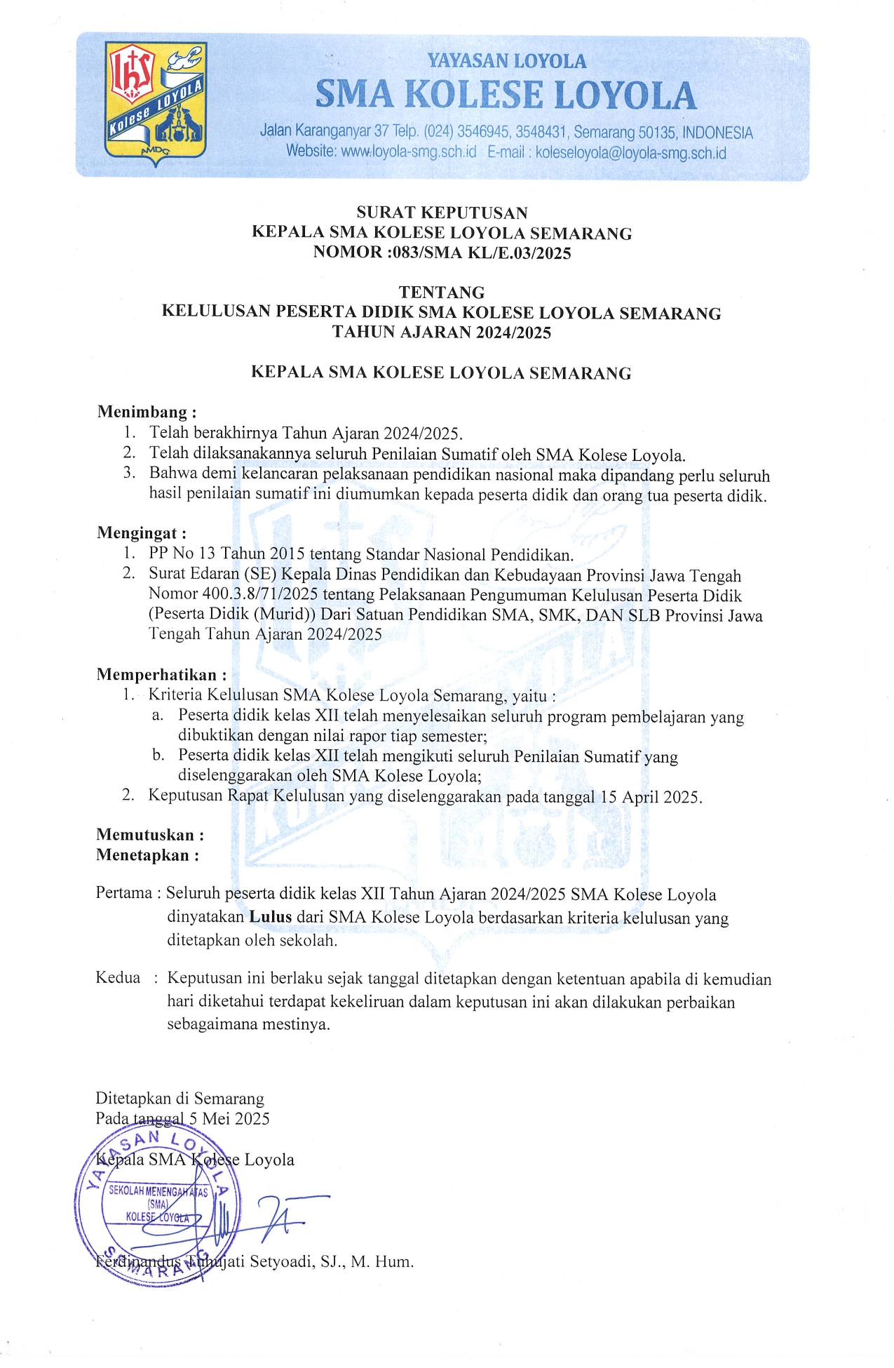 Proficiat bagi Ibu Bapak Orang Tua, Ibu Bapak Guru dan Tenaga Kependidikan yang telah mendampingi siswa kelas XII selama tiga tahun di SMA Kolese Loyola.