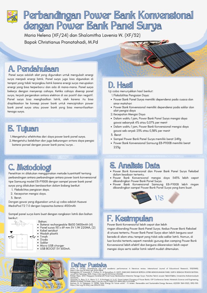 Perbandingan Power Bank Konvensional dengan Power Bank Panel Surya / Curriculum - Penelitian dan Poster Ilmiah / By dhn Penelitian Oleh : Maria Helena (XF / 24), Shalomitha Lavenia (XF / 32)