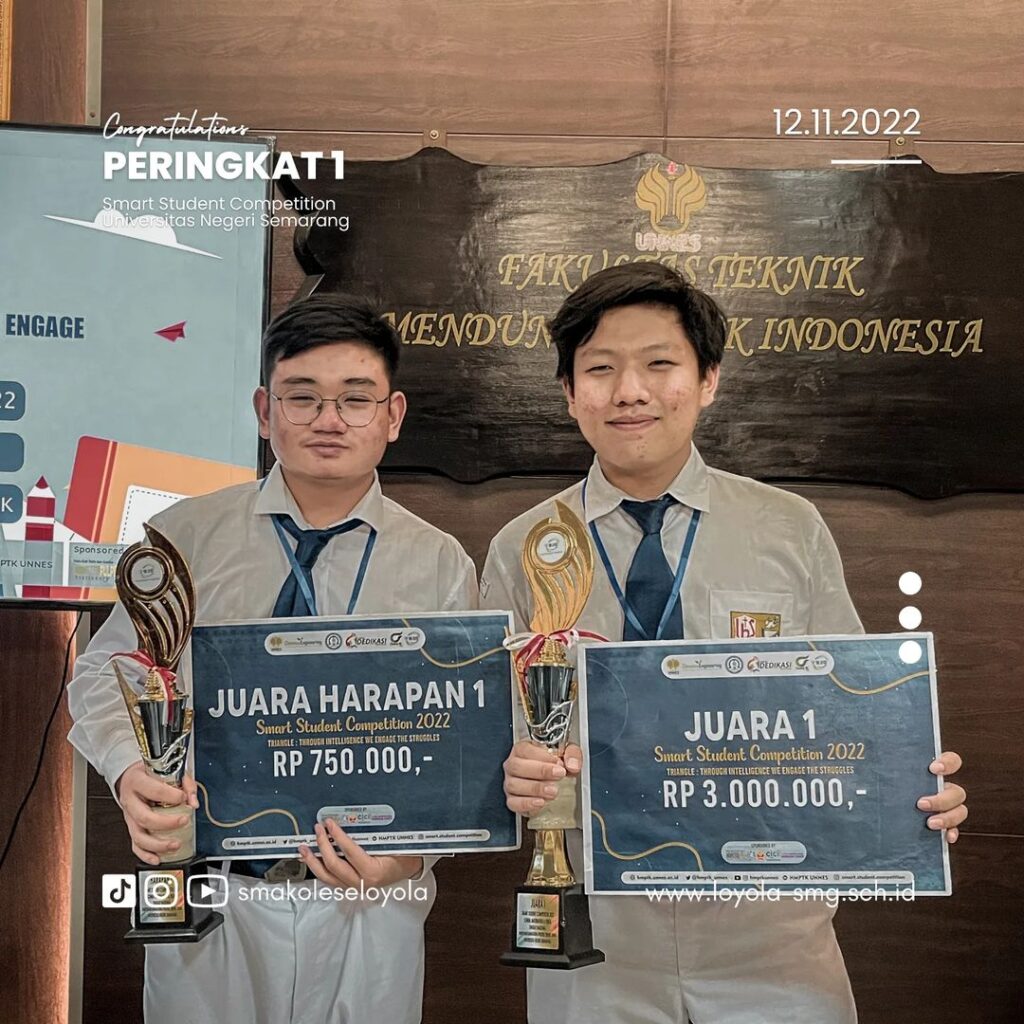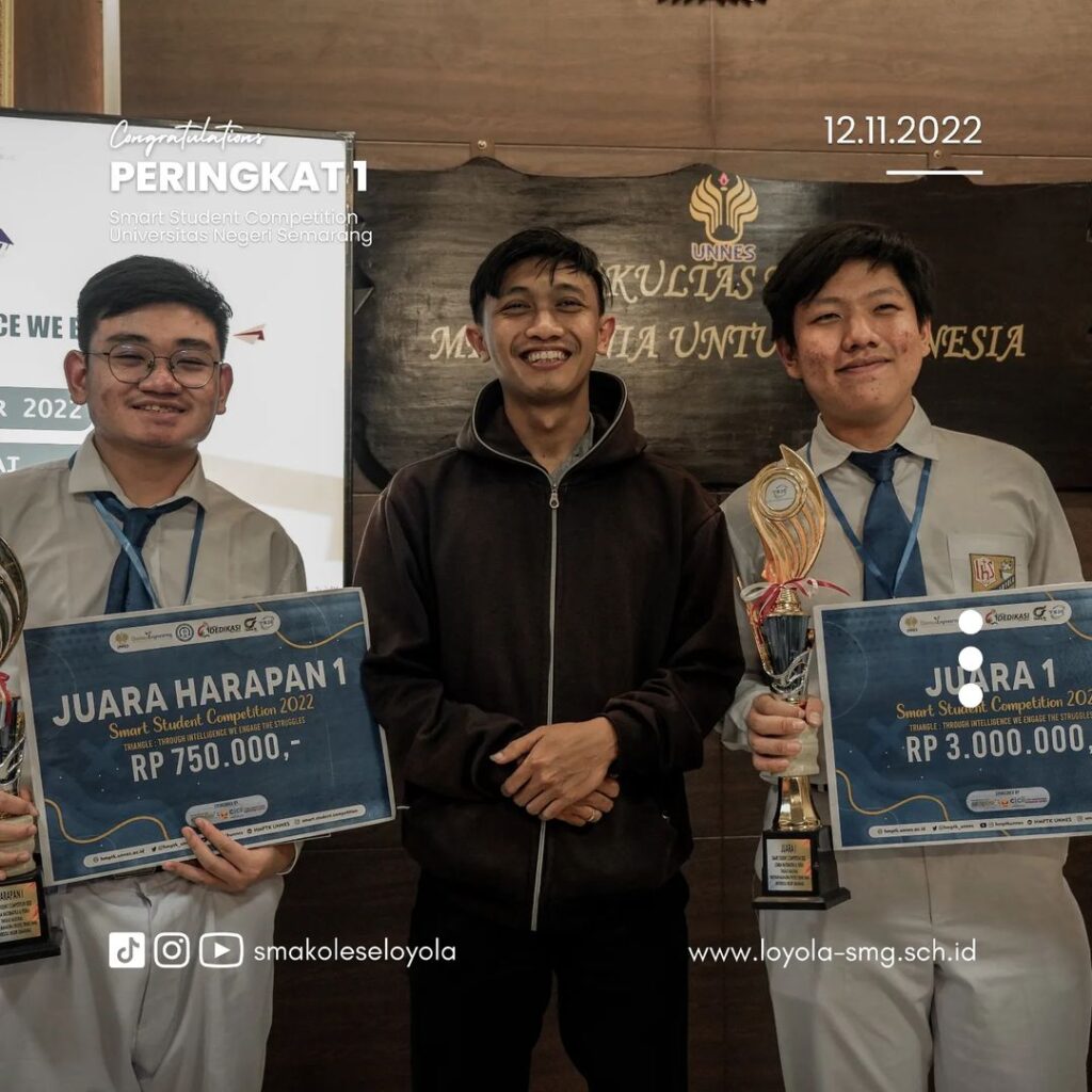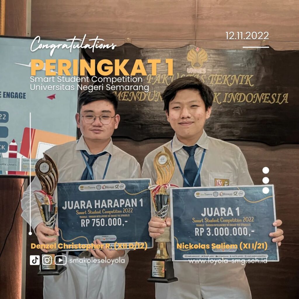 Selamat kepada Nickolas Saliem (XI I/21) telah meraih peringkat 1 dan Denzel Christopher Raharjo (XII D/12) peringkat harapan 1 dalam Smart Student Competition. Kompetisi ini merupakan olimpiade SMA dan SMK tingkat nasional yang diselenggarakan oleh Himpunan Mahasiswa Profesi Teknik Kimia Fakultas Teknik Universitas Negeri Semarang. Mata pelajaran yang dilombakan meliputi Matematika dan Fisika. Kegiatan final Olimpiade ini dilaksanakan pada hari Sabtu, 12 November 2022 di Gedung Dekanat Fakultas Teknik Universitas Negeri Semarang.