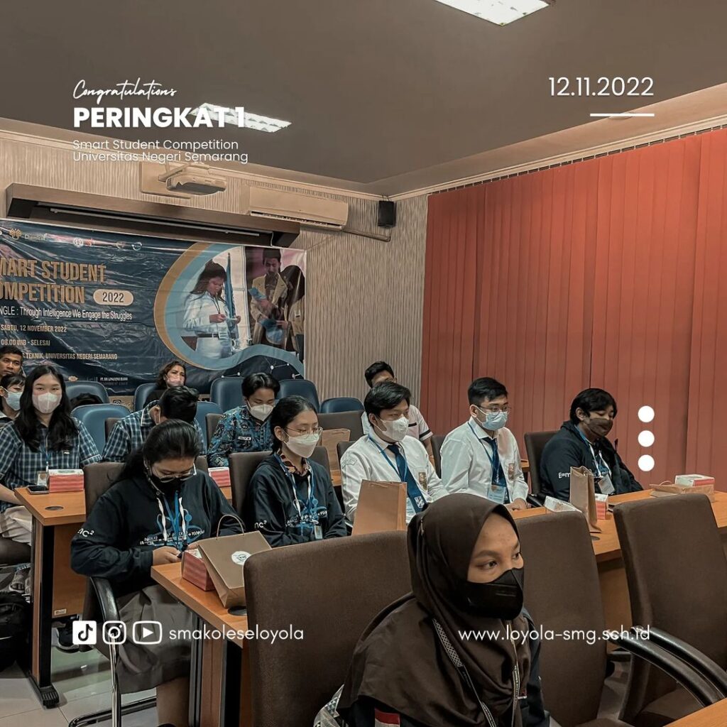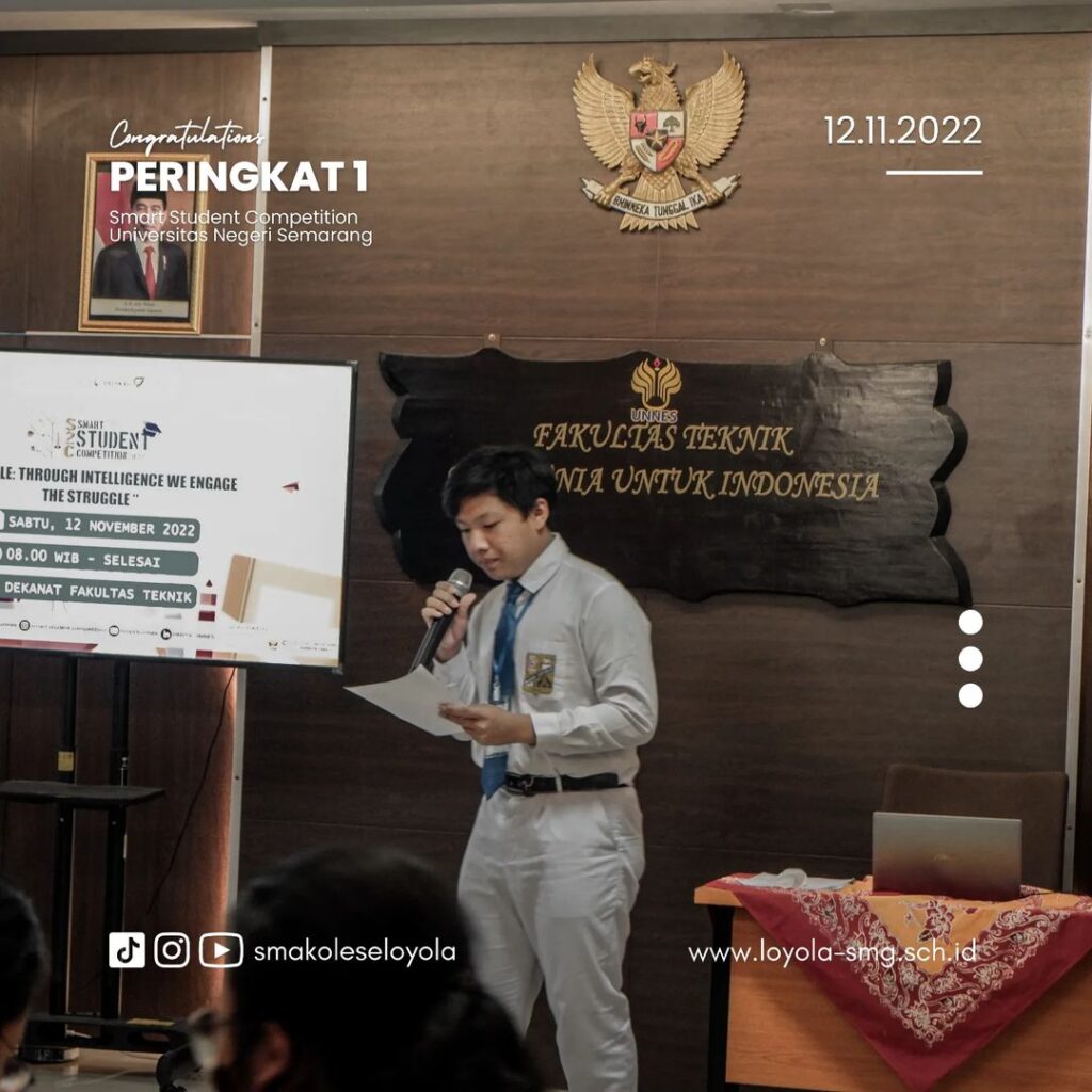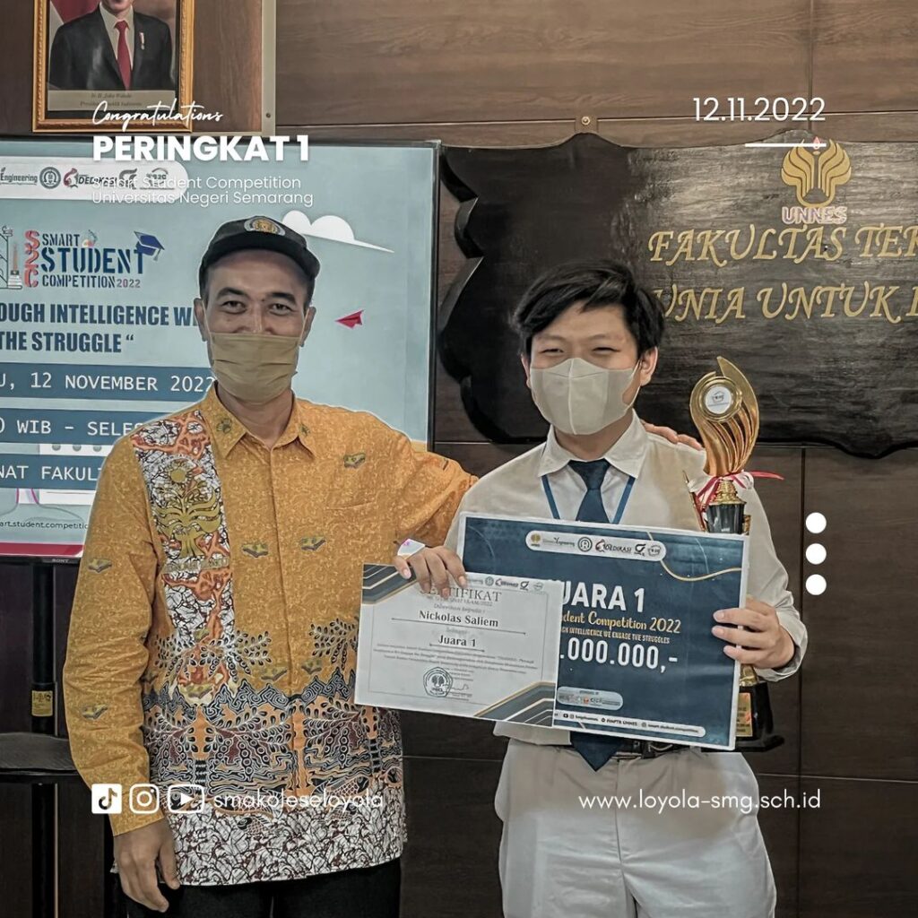 Selamat kepada Nickolas Saliem (XI I/21) telah meraih peringkat 1 dan Denzel Christopher Raharjo (XII D/12) peringkat harapan 1 dalam Smart Student Competition. Kompetisi ini merupakan olimpiade SMA dan SMK tingkat nasional yang diselenggarakan oleh Himpunan Mahasiswa Profesi Teknik Kimia Fakultas Teknik Universitas Negeri Semarang. Mata pelajaran yang dilombakan meliputi Matematika dan Fisika. Kegiatan final Olimpiade ini dilaksanakan pada hari Sabtu, 12 November 2022 di Gedung Dekanat Fakultas Teknik Universitas Negeri Semarang.