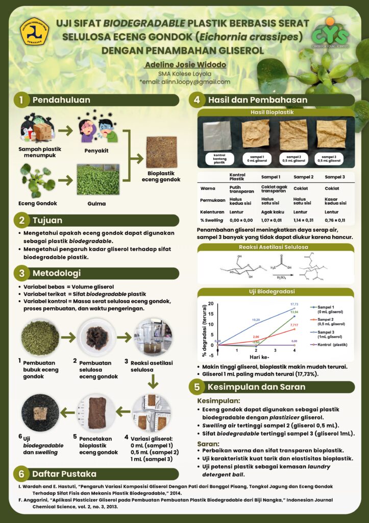 Uji Sifat Biodegradable plastik berbasis serat selulosa eceng gondok (Eichornia crassipes) dengan penambahan gliserol / Curriculum - Penelitian dan Poster Ilmiah / By dhn Penelitian Oleh : Adeline Josie Widodo
