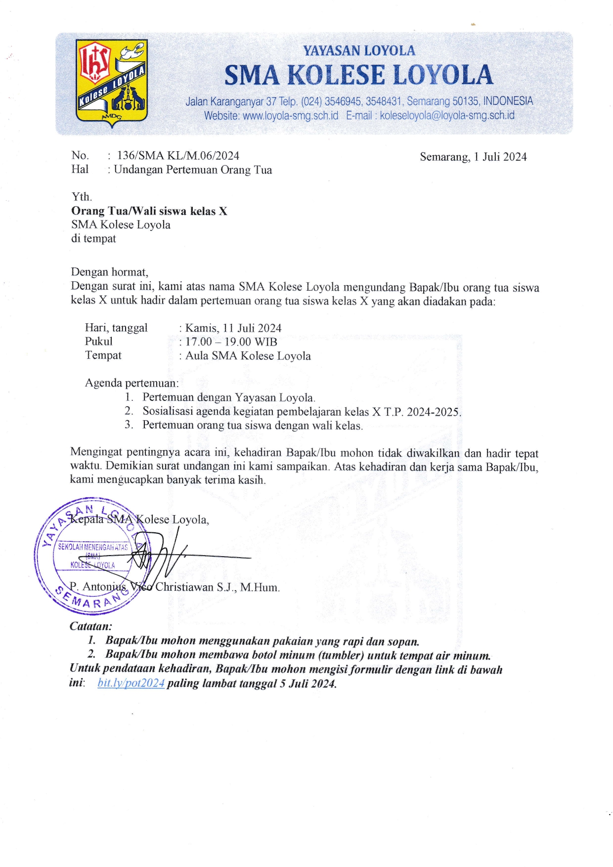 Dengan surat ini, kami atas nama SMA Kolese Loyola mengundang Bapak/Ibu orang tua siswa kelas X untuk hadir dalam pertemuan orang tua siswa kelas X.